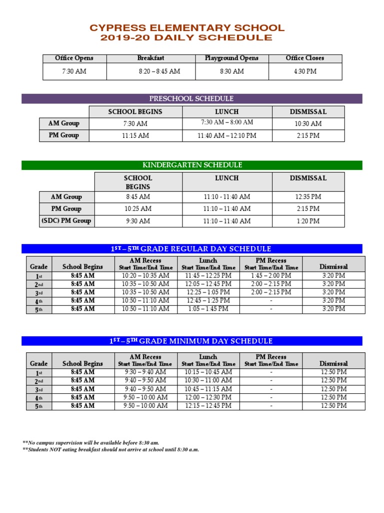 Cypress Elementary School 201920 Daily Schedule PDF Educational Institutions Students